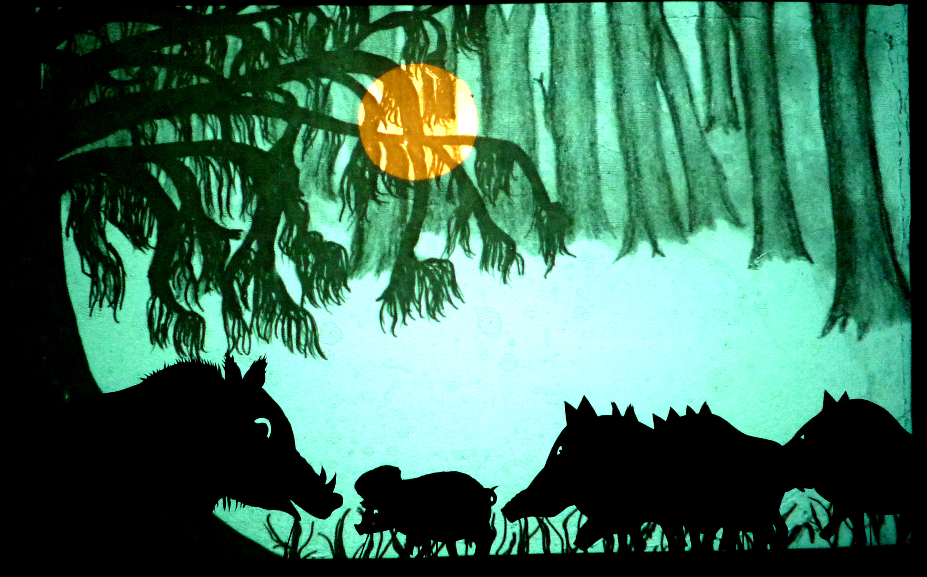 Am Morgen trifft er Sophia die Eule, die ihm Mut macht. Dann trifft er die Hausschweine die ihn als Wildschwein beschimpfen.
